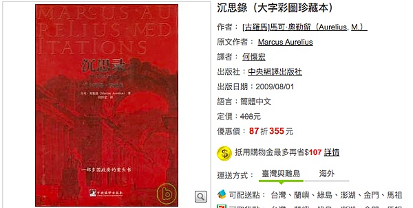 《沉思錄》是古羅馬時期哲學家皇帝奧理略的思想日記,可說是哲學必讀經典,師大圖書館館藏是北大教授何懷宏的簡體譯本,除了是大陸用語外,有些語句讀起來有點拗口。若有機會,希望可以再閱讀其他譯本。