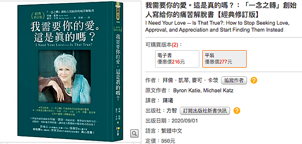 《我需要你的愛。這是真的嗎?》為《一年之轉》的全新修訂版。作者經歷憂鬱症,住在精神病院裡,有天起床突然像是頓悟了一番,回到家庭,連家人也為她180度大轉變感到難以置信。蛻變後的作者,也透過自己的「轉念作業」,讓大家知道,很多所謂「都是他讓我⋯⋯」的情緒,其實都與他人無關,而是自己的情緒在作祟,或是自己的解讀,而形成自己的價值觀。